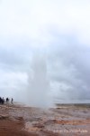 A unos 15 km de distancia se encuentra Geysir, la fuente termal de cuyo nombre deriva la palabra para definir a todos sus semejantes: géiser. El original Geysir no funciona desde hace unos cuantos años, desde que los turistas se dedicaban a tirarle piedras y monedas, que acabaron por obstruir la salida del chorro de agua. Una columna de agua que alcanzaba los 70 metros de altura. Por suerte para los visitantes hay otro géiser a unos pocos metros, que lanza chorros de agua a una altura entre los 20 y los 30 metros, y a una temperatura de cien grados Celsius cada pocos minutos. En los momentos de calma, la boca del géiser se encuentra anegada de agua. De vez en cuando surgen pequeñas burbujas desde su interior y una ligera agitación despierta su calma. Pero es justo en el momento en el que va a reventar la columna de agua cuando el la visión se vuelve mágica. Entonces se forma una burbuja azul magnifica, de brillos intensos, como un ojo de cristal turquesa que lo ve todo, y el estallido de agua nos deja petrificados ante tan espléndido espectáculo.